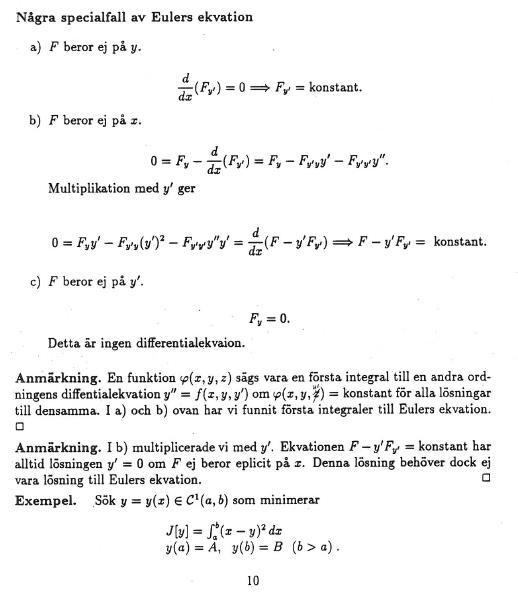 Tack för dina fina svar, uppskattas verkligen. Det kan hända att jag beskriver problemet lite felaktigt då min kunskap inom detta område är tämligen begränsat. Men då integranden F ej beror av x (F(x,y,y')=F(y,y')), används då inte ett specialfall: