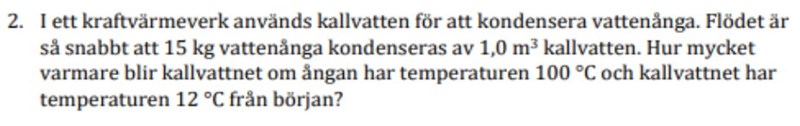 I det andra flödet så kommer 12° vatten in och kyler ångan så den värme som frigörs från ångflödet tillförs det kylande vattnet som då blir varmare och frågan är då hur mycket varmare.