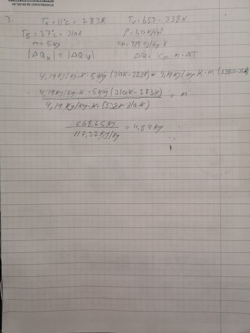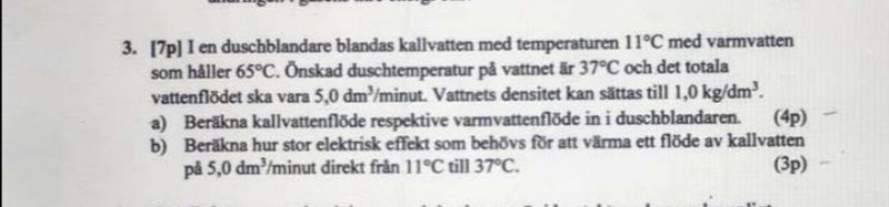 Jag tog att dQ för kalla vatten = dQ för varma. Och dQ = CP * m* dT, och för massan tog jag då 5 dm3 som är samma sak som 5kg och la in det kalla vatten och omvandla formlet så att massan för varma vatten belv själv och fick en resultat på 4.84kg alltså 4.84 dm3