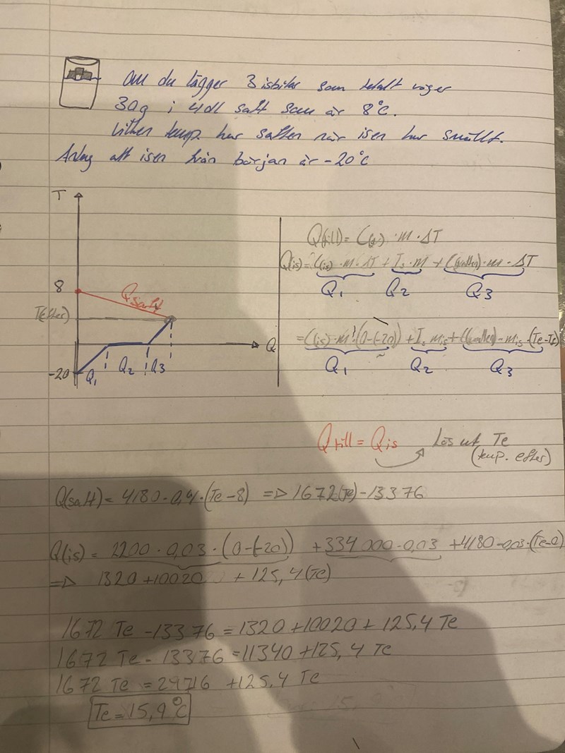 Anledningen till att du fick fel är att du satt ΔQ(saft) = ΔQ(is) och löst för Te. Då gåt Te åt fel håll. Om Q(is) skall öka, så måste ju även Q(saft) öka. Det ger att Te ökar.