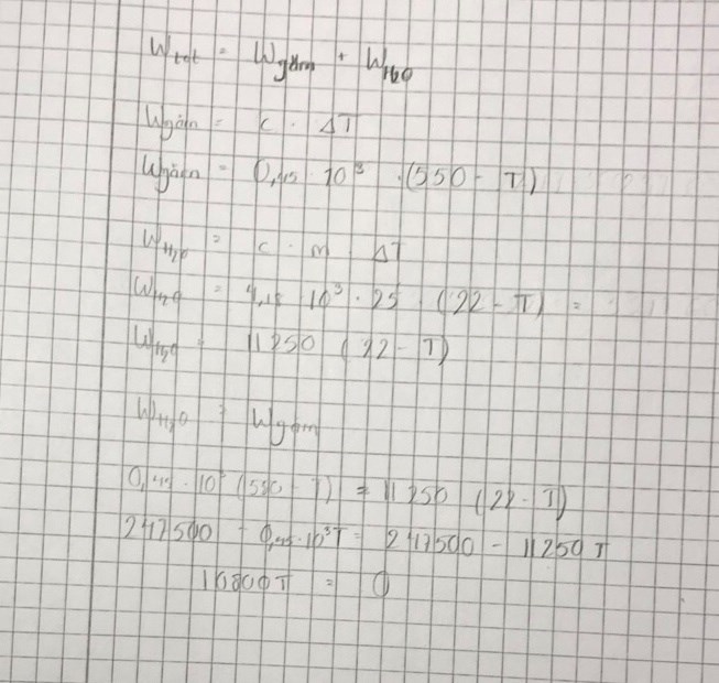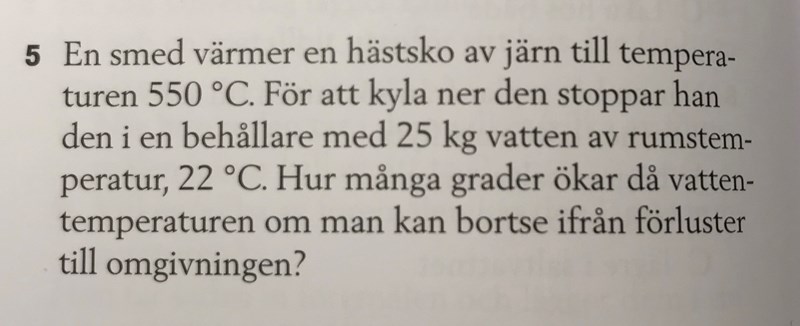 Från början har vattnet temperaturen 22 grader och hästskon 550 grader. Efteråt har både vatten och hästsko samma temperatur. Vattnet har tagit upp lika mycket energi när det värmdes som vad hästskon har avgivit här den svalnade.