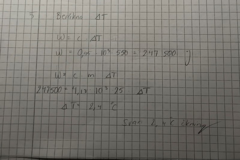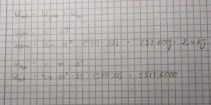 Nej, jag har först beräknat energin som krävs för att hästskon ska kunna värmas till 550. Jag tolkar även denna energi som den ”värmeenergi ”som hästskon har och som den kan värma vattnet med, eller som du beskrive