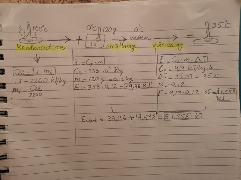 Hej, jag har fastnat i den här frågan. Jag vet att för att ångan ska kondensera (samma energi vid förångning) så avger den energi som vi kan ta reda på av en formel, osäker på vilken formel, (E=c*m*delta T) eller (Q=lå*m). Har testat båda men utan lycka. Sen har vi isen som ska smälta och få energi, sen ska vi summera båda och hitta sist massan för ångan. Jag vet inte hur ska jag göra. hjälp mig tack