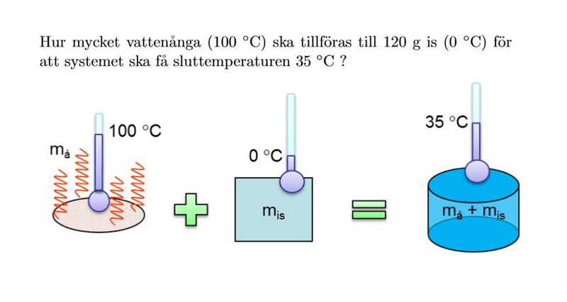Räkna ut de fyra värmemängderna jag skrev om i mitt förra inlägg. I två av dem kommer variabeln att ingå. Du vet att det behöver tillföras lika mycket värme för att smälta isen och värma det vattnet till temperaturen 35 grader, som det avges när ångan kondenseras och det vattnet svalnar till 35 grader. Du kan alltså räkna fram ett värde på .