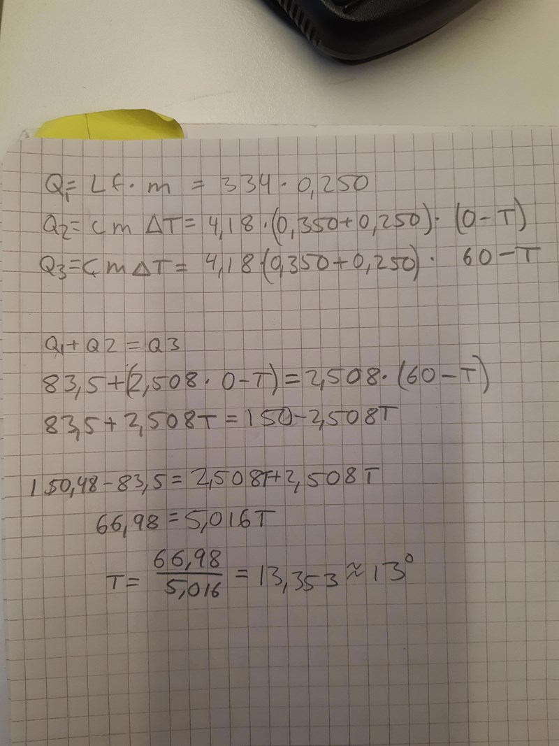 Vad händer då man lägger 250 g nollgradig is i 350 g vatten med temperaturen 60 °C?