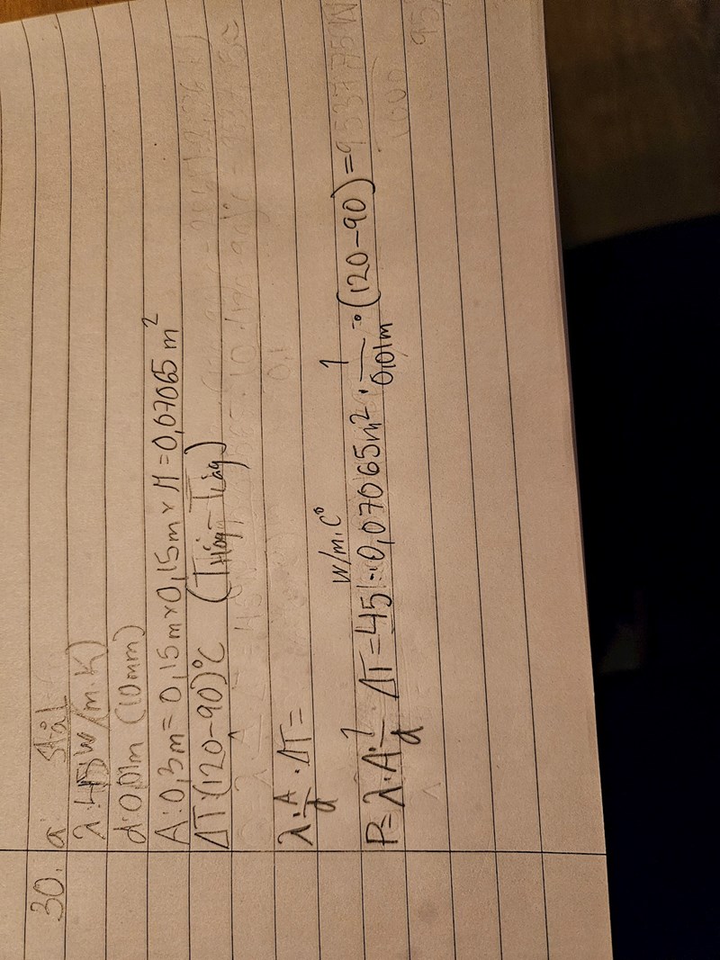 En kokgryta, som värms genom att het olja cirkulerar under botten, innehåller vatten med en temperatur av 90 grader celsius. Oljan har en temperatur av 120 grader celsius och botten mellan hetoljan och vattnet är 10 mm. Bottenytan 0.3 m. Hur stor värme mängd passerar per tidsenhet, dvs hur stor är värmeeffekten hos grytan om den är i stål?