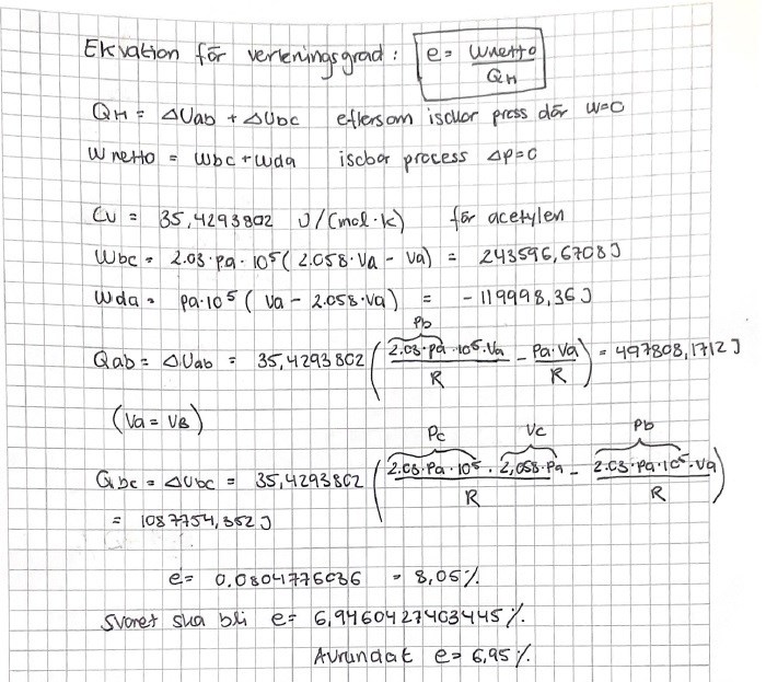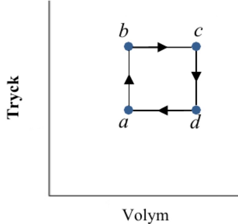 Figuren visar en kretsprocess som genomgås av acetylen-gas som kan betraktas som ideal. I processerna ab och bc tillförs värme medan det bortförs värme i processerna cd och da. Trycket i a är pa, trycket i c är 2,03·pa, volymen i a är Va och volymen i c är 2,058·Va.