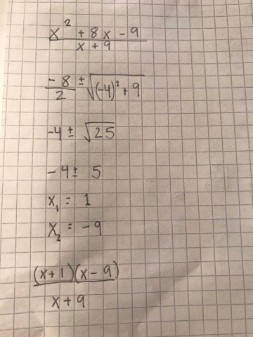 Du har gjort fel på sista raden när du sätter in rötterna. De båda parenteserna skall vara respektive , alltså (x-1) respektive (x-(-9)).