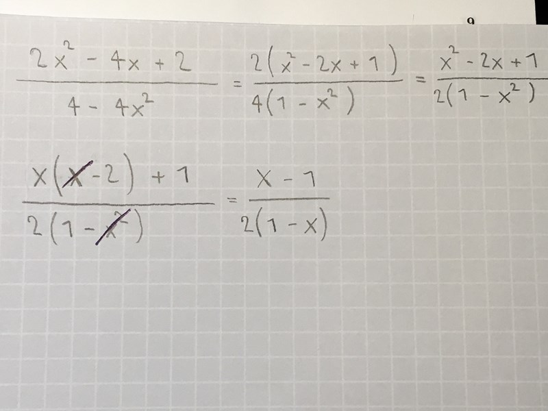 Du har missat att byra ut 4 mot 2 i x-termen när du bryter ut 2. Man kan faktorisera båte täljare och nämnare mera (om man räknat rätt på täljaren).