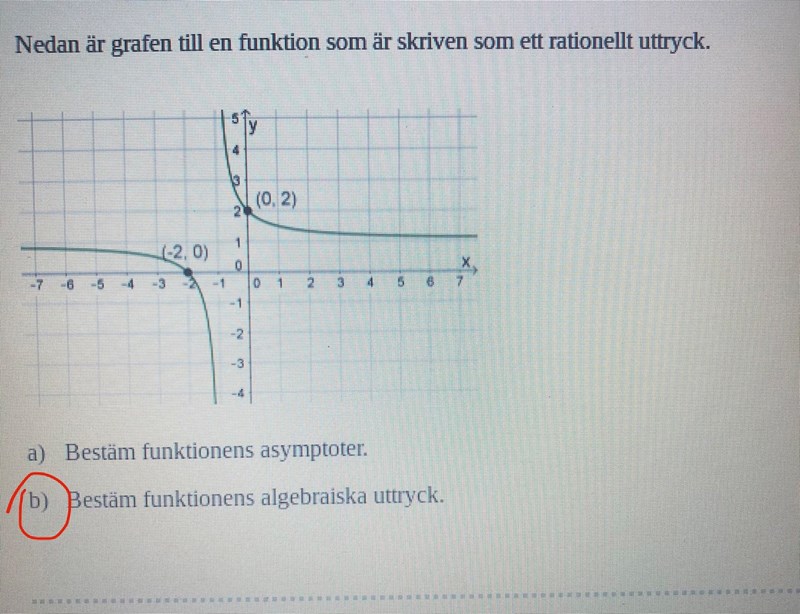 Du vet ifrån grafen att kurvan går genom punkten (0,2) vi hade kunnat välja punkten (-2,0) istället. Då konstaterar de att om x= 0 skall funktionen ge värdet 2. Då kan inte täljaren i uttrycket bara vara x, det kan inte heller vara kx då detta skulle innebära att f(0) = 0. Därmed kan täljaren vara x+k.
