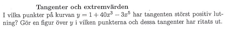 stationära punkter dvs. max eller min värden (eller terasspunkter). Dock är algebran för att nå nollställena ganska svår för denna uppgiften också men