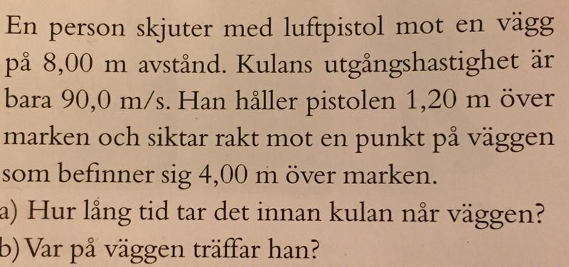 Jag har fastnat på b). På a) fick jag fram att tiden är 94 ms vilket är korrekt, pistolens vinkel är 19,3 grader. På b) använde  jag formeln y=v0*sinα*t-gt²2=90*sin(19,3)*0,094-9,82*0,094²2=2,8 m. Men svaret är 44 mm, vad för fel har jag gjort?
