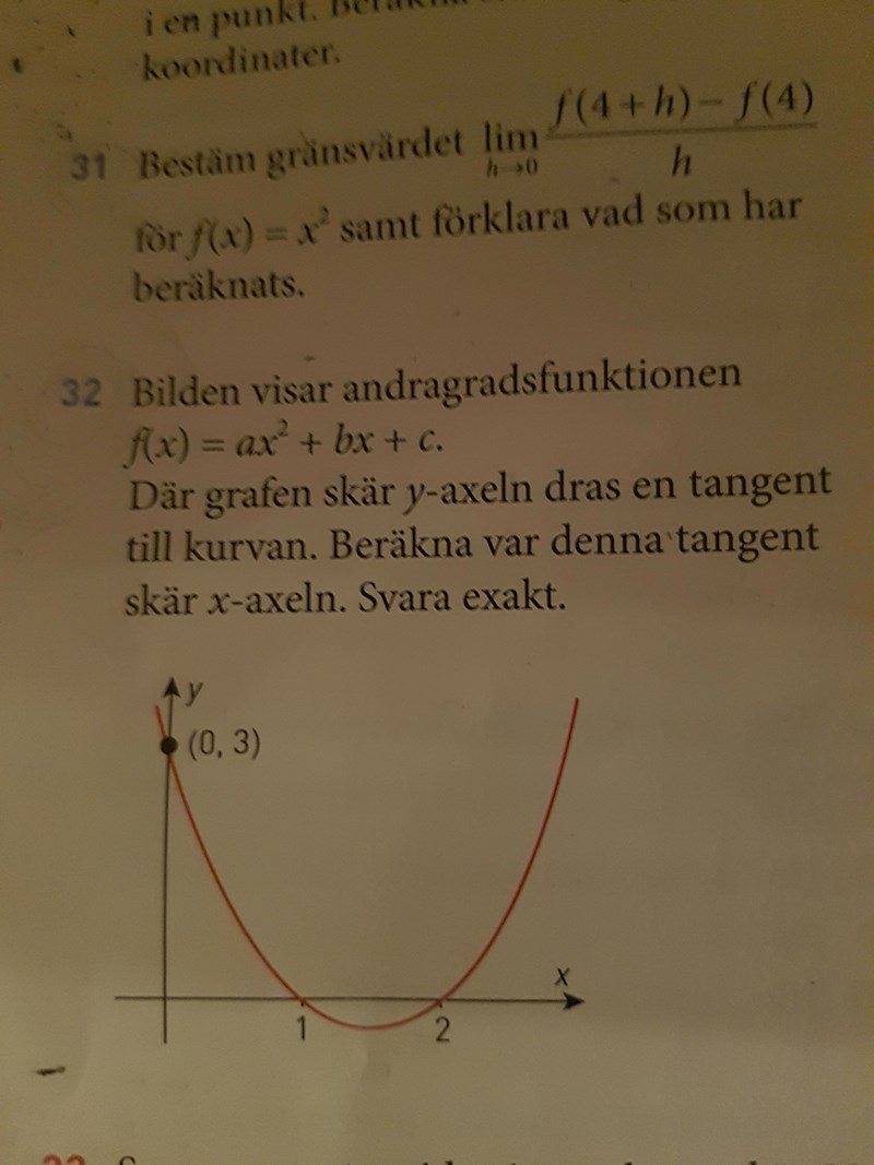 Nu undrar vi vart tangent skär x-axeln vilket vi kan lista ut genom att lösa ekvationen: