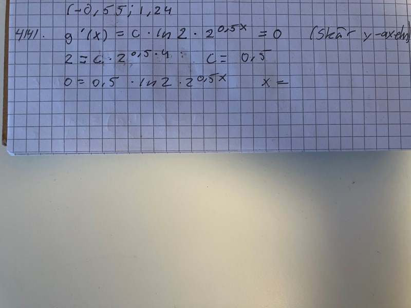 Jag fick att derivatan av g’(0) = 0.5 x ln 2