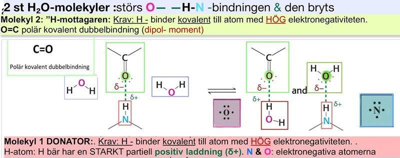 Accteptorn: behöver ha fria elektron par som kan para med H. Samt också ha partikel ladning men då - eftersom (+/-). Infogar en bild som jag undrar om jag tolkat det rätt i fallet med C=O kovalent polär binding. Här gäller att O har en - partikel laddning precis som i h2o. Samg fria elektron par.