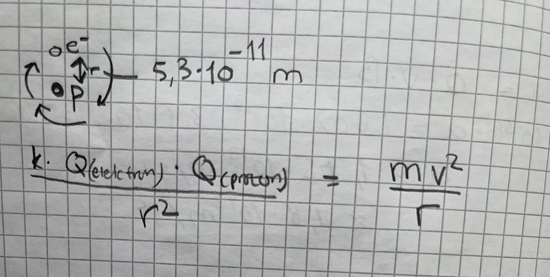 I en enkel modell av en väteatom kan man se elektronen röra sig runt protonen i en cirkelbana med radien 5,3*10^-11 m. Hur stor är elektronens hastighet i banan?