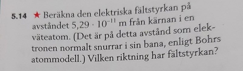 Bayan Ali skrev:Beräkna den elektriska fältstyrkan på avståndet 5,29*10^(-11) m från kärnan i en väteatom.