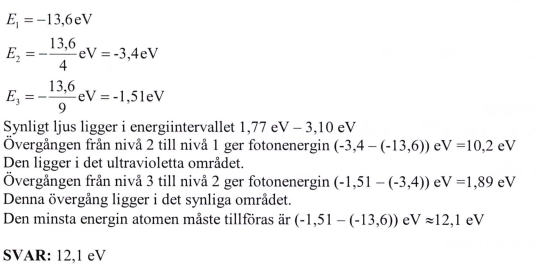 Energinivåerna hos en väteatom kan beräknas genom , där Ej=13,6eV och n=1,2,... .Bestäm den minsta energi man måste tillföra en väteatom i grundtillståndet för att synligt ljus ska kunna sändas ut från den exciterade atomen.