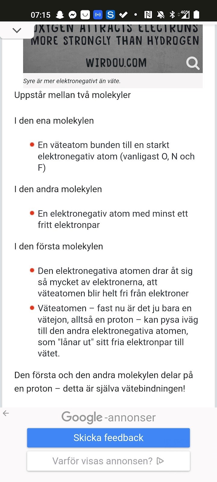 Funderar också på punkt tre i bilden, det är en intermolekylär bindning men den elektronegativa atomen drar till sig elektroner från vätet? Då blir det ju ej någon partiell laddning som attraherar utan en fullständig elektronövergång som i en jonbindning? Ursäktar om det är flummigt skrivet, förstår resterande bindningar bra men vätebindningen tycker jag är klurig.