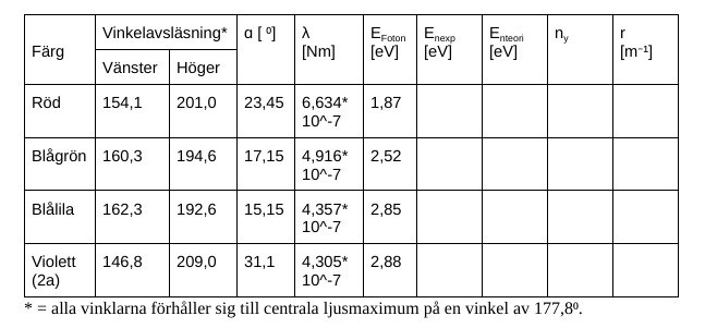 Det ser ut som att du sedan har beräknat energiskillnaden mellan dessa elektronbanor som beskrivs i teoridelen. Dessa har du noterat i -kolumnen. Har jag uppfattat dig rätt?