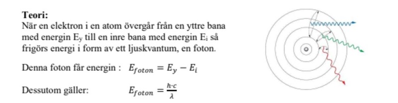 Vi tar ett exempel: Det röda ljuset skapas vid övergång till . Där har du mätt fotonenergin till att vara . Enligt teoridelen blir då .