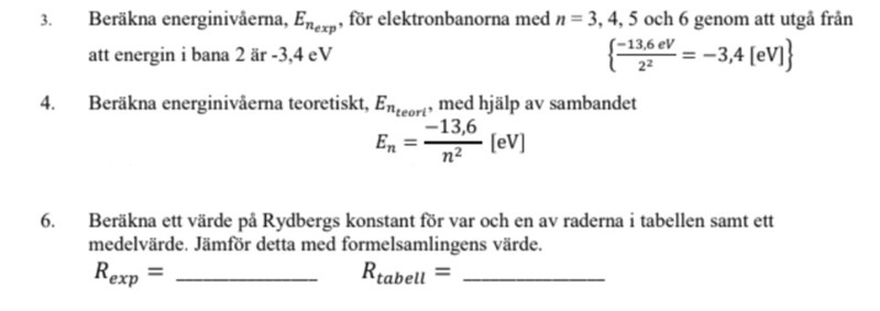 Bra! ( är elektronbanans energinivå. Inte ljuset. Men jag tror du förstår). Nu kan du samtidigt göra punkt4 för den här nivån, dvs jämföra med vad det teoretiska värdet blir.