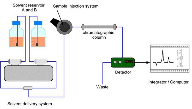 Bilden nedan visar en förenklad men schematisk bild över designen av vätskekromatografi där solvent A och solvent B representerar de två olika mobilfaserna. Mobilfasen kommer att färdas framåt med hjälp av en högtryckspump (den gråa lådan i början). Du injicerar provet i sample injector och mobilfasen kommer då att ta med din analyt fram igenom kolonnen - den kommer då att separera utifrån hur den interagerar med den stationära fasen.