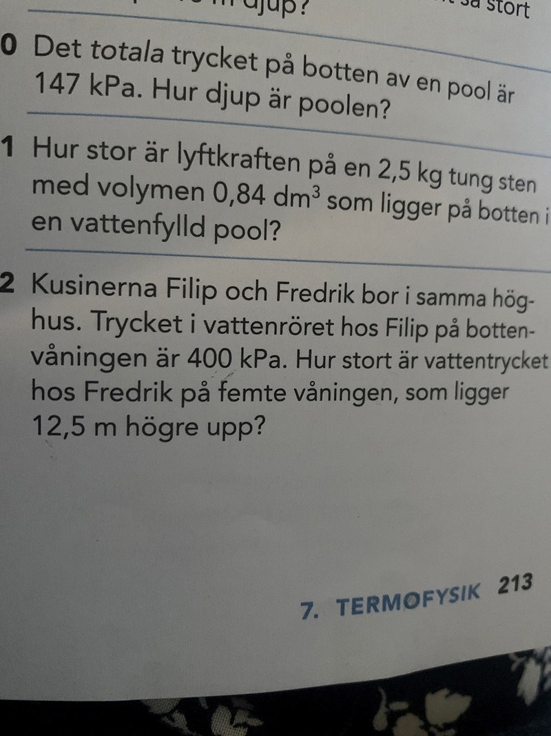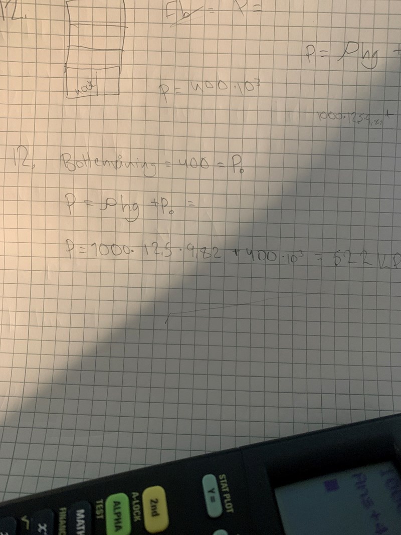 Jag behöver lite hjälp med denna uppgiften. Trycket på bottenvåningen är 400KPa och vi ska ta reda på trycket på femte våningen. Jag har försökt räkna på den men har fått fel svar och förstår inte riktigt vad jag har gjort för fel då jag har använt rätt formel.