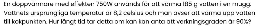 Börja med att räkna ut värdet på den energimängd som behöver tillföras för att värma 185 g vatten från temperaturen 8,2 oC till kokpunkten. Sedan kan vi gå vidare och räkna ut hur mycket energi som behöver tillföras om verkningsgraden inte är 100 %.