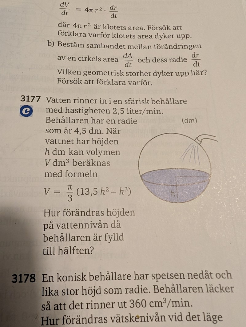 Måste först ta reda på hur mycket volymen förändras när behållaren är fylld till hälften genom att derivera uttrycket för V som är givet.., och sen ta reda på hur mycket h ändras när volymen förändras med 2.5L/min per minut i exakt det tillfället..