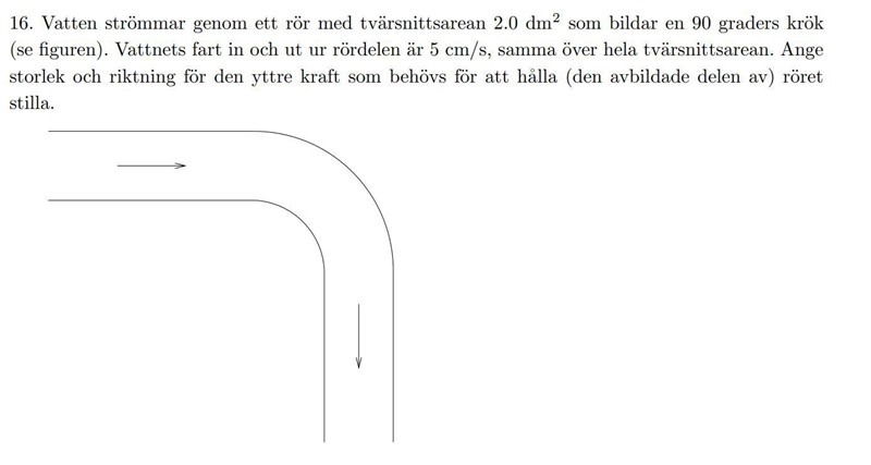 vattnet åket 1/4 av en cirkel i svängen och röret har en tvärsnittsarea på 0.02m^2. Förstår inte hur area, kraft och hastighet ska hänga ihop