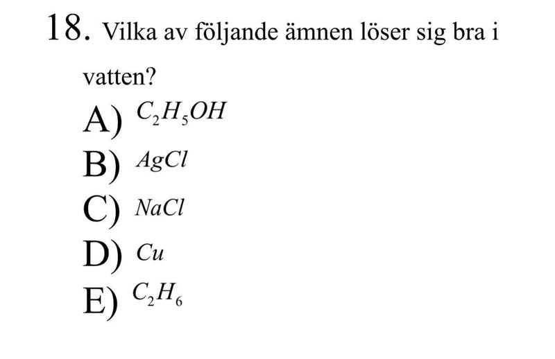 Ämne A, C och D borde du känna igen från verkligheten och veta vilka av dem som är vatenlösliga.