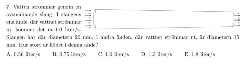 Flödet in och ut måste vara lika stort efter tid, eftersom det ansamlas vatten om flödet in är större och när den ansamlade vattenmängden fyller hela slangen, blockerar det nytt vatten att flöda in i högre takt än det flödar ut. Dock, obs! flödet in skulle kunna vara större än flödet ut i början, eftersom då har det inte hunnit ansamlats vatten i slangen som stoppar flödet in. Är det meningen att man ska svara efter vad som händer om man låter det flöda ett tag, eller kan det vara så att man ska räkna ut att en diameter på 15mm i slangen kan flöda ut 1.0 liter/s. Hur räknar man ut det? Ska man räkna att volymen av vattnet som flödar ut är lika stor som volymen av ett klot med diametern 15mm?