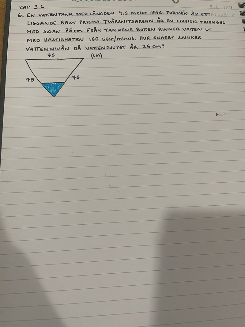 Det ger dig att dhdt=0,18943=0,18·939=1,6239\frac{dh}{dt}=\frac{0,18}{\frac{9}{4\sqrt{3}}}=\frac{0,18\cdot9\sqrt{3}}{9}=\frac{1,62\sqrt{3}}{9} meter per minut.