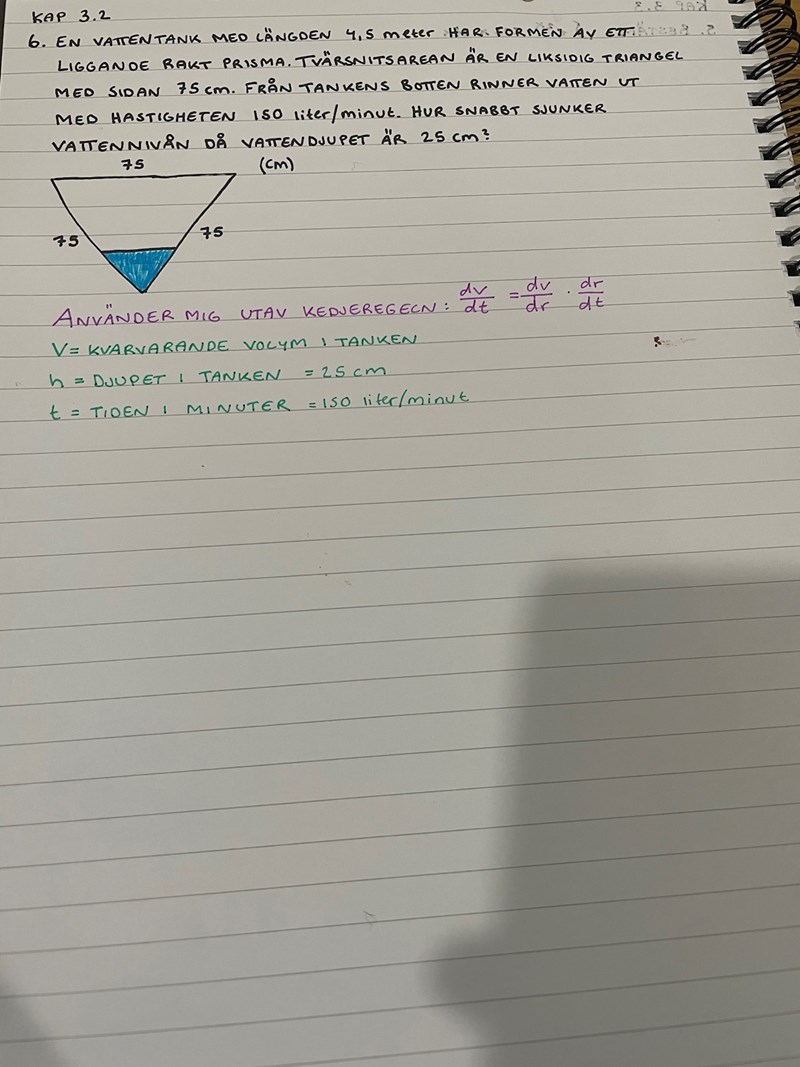 Kedjeregeln ger oss dVdt=dVdh·dhdt\frac{dV}{dt}=\frac{dV}{dh}\cdot\frac{dh}{dt}