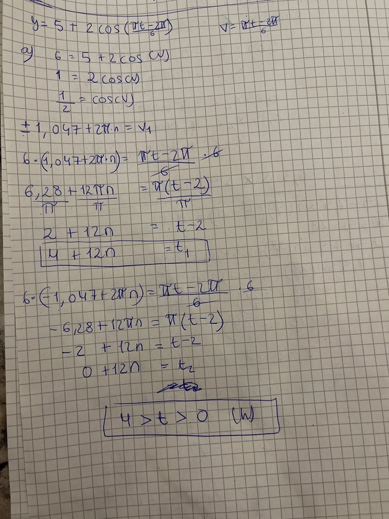 a) Du har fått t1=4+12n och t2=0+12n. Då fick du intervallet 0 till 4. Vilket intervall får du med n=1?