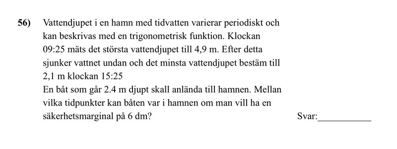 Smutstvätt skrev:Det spelar ingen roll om du väljer cosinus eller sinus. Du kommer att få olika värden på A, B, C respektive D, men båda fungerar. Vi vet att maxdjupet är klockan 9:25, och då är vattendjupet 4,9 m. Det minsta vattendjupet inträffar klockan 15:25, och då är det 2,1 meter djupt. Vilken period ger detta? Vilken amplitud? :)