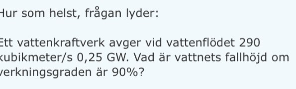 jag vet att energin som fås ut efter att vattnet har passerat turbinen är 0.25*10^9W