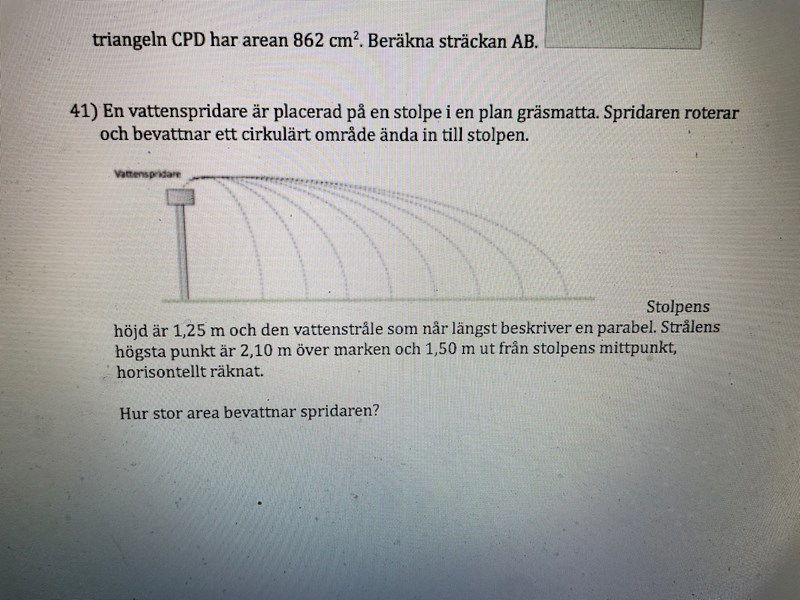 Stolpens höjd är 1,25 m och den vattenstråle som når längst beskriver en parabel. Strålens högsta punkt är 2,10 m över marken och 1,50 m ut från stolpens mittpunkt, horisontellt räknat.