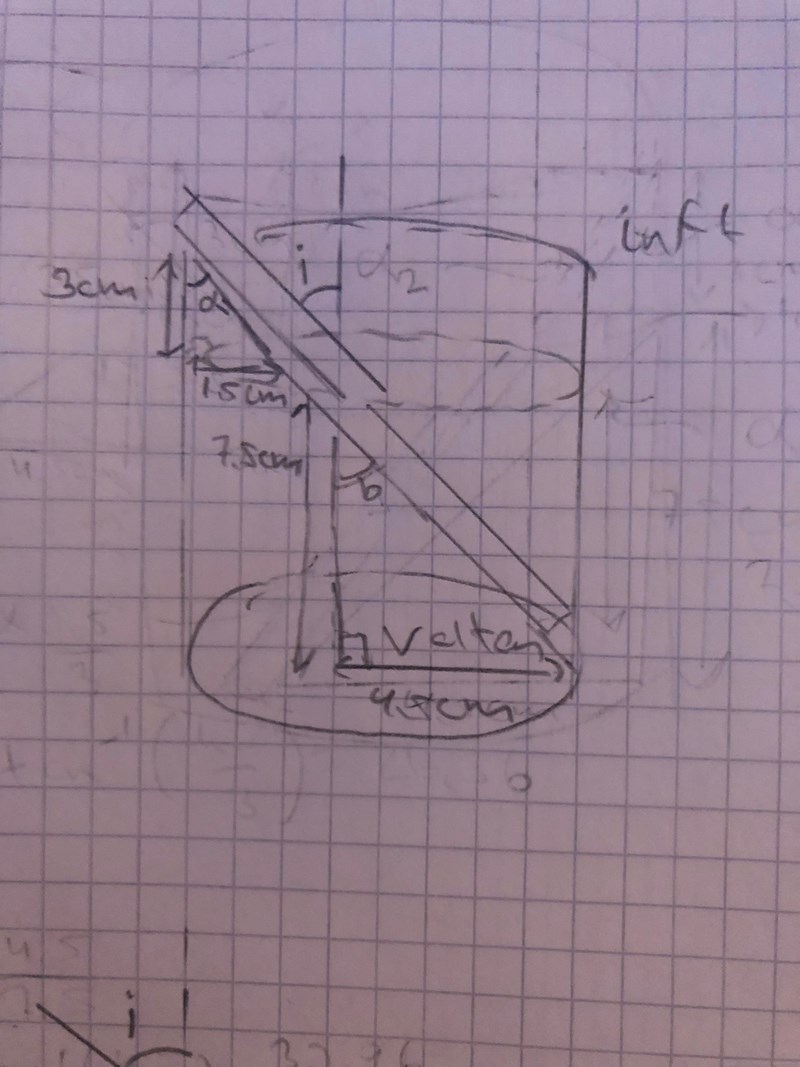 ja får samma som du ja ska , de är en deluppgift ingen labb men den skulle lösas experimentellt, ja de ska ja göra, ja men precis, glaset har inte samma radie eller diameter överallt utan nertill är radien 5 cm och upptill 6 cm så medelradien blir ju 5,5 cm angivna måtten på kateterna på trianglarna stämmer