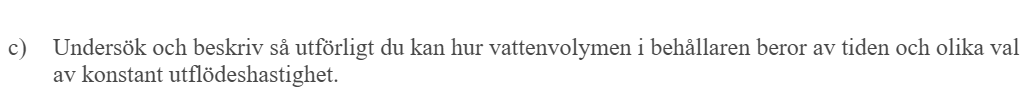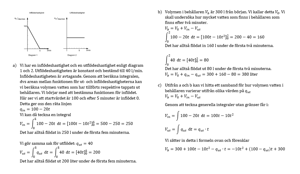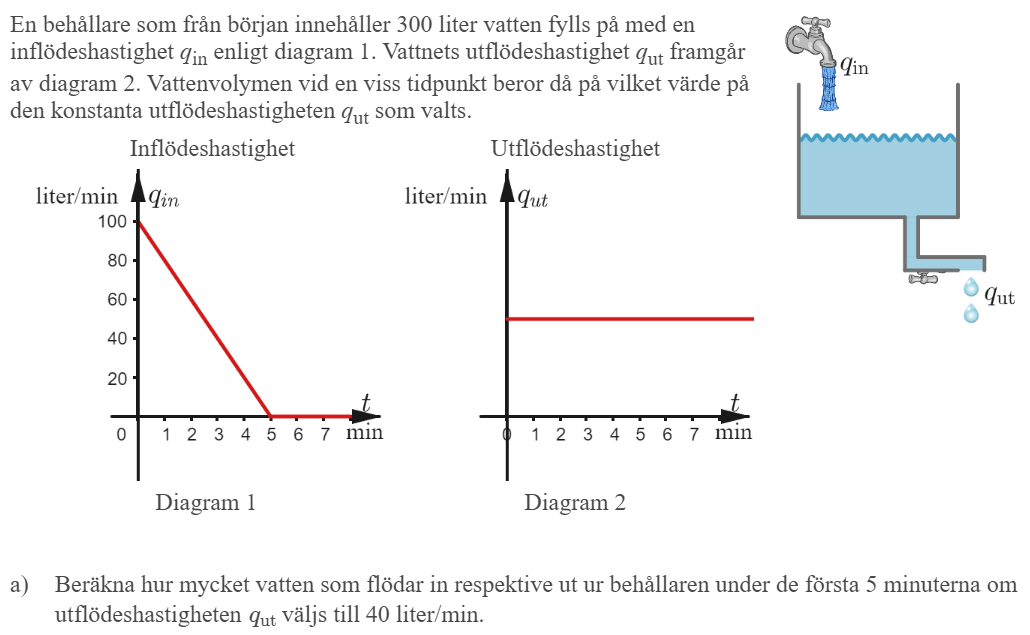 Volym vatten som flödar in = INT_0^5 qin(t) dt = INT_0^5 (100-20t) dt = ...