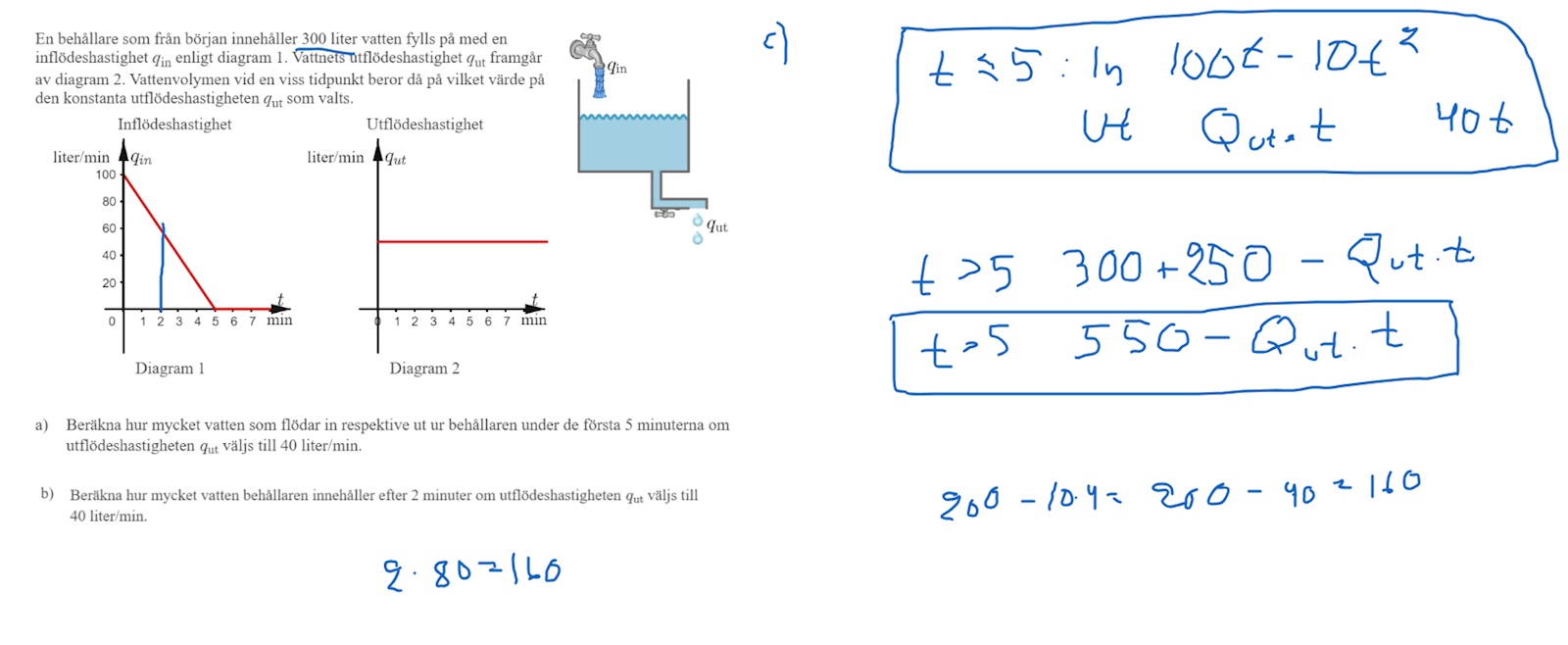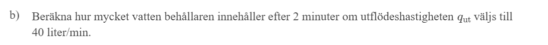 Volym vatten som flödar ut = INT_0^5 qut(t) dt = INT_0^5 40 dt = ...
