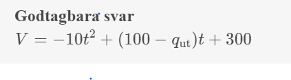 Volym vid tiden T: V(T) = INT_0^T qin(t) dt- INT_0^T qut(t) dt = INT_0^T (100-20t) dt - INT_0^T 40 dt