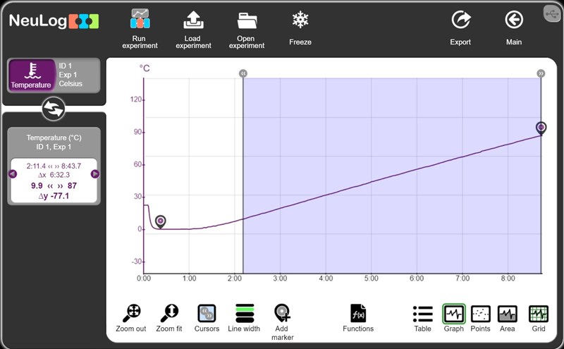 Vi använde ett program som kallas NeuLog som gav oss mätvärden för temperatur och tid, om man kollar till vänster om bilden ser man värdena som jag räknade med (värdena gäller det som är markerat med blått på grafen).