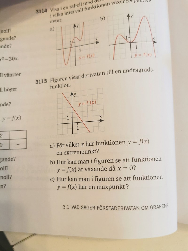 Jag skulle vilja ha hjälp med uppgift 3115. Det står "Figuren visar derivatan till en andragradsfunktion." = figuren visar tangenten/lutningen till andragradsfunktionen.