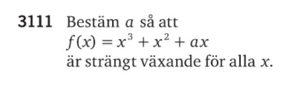 jarenfoa skrev:Strängt växande betyder att derivatan av funktionen alltid skall vara strikt större än noll, :