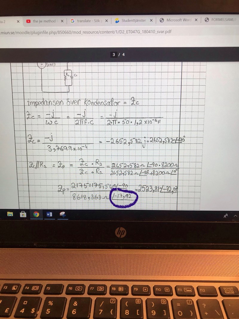 Då -funktionen inte vet om det är nämnare eller täljare som är negativ brukar det vara en bra idé att rita in det komplexa talet i ett komplext talplan för att utröna vad vinkeln är. I detta fall ser du enkelt att: