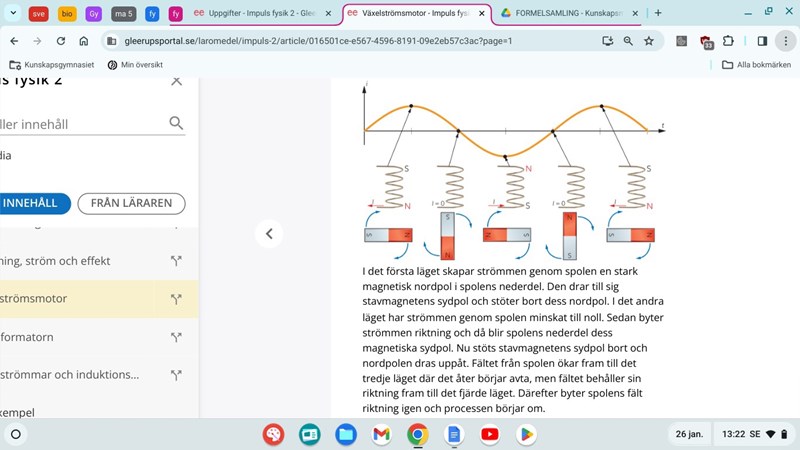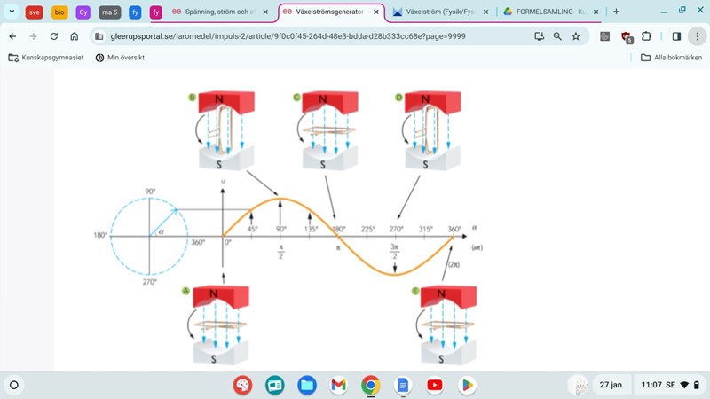 Om ni kollar här när det gäller en spole som roteras i ett magnetisk fält så vet vi att i första steg vill spolen rotera och bli parallell med magnetiska fältriktning, detta gör att vinkeln blir 0 och därav induceras ingen spänning, spänning är 0. När den därefter vill bli vinkelrät i steg 2 får vi största spänning eftersom vinkeln blir 90 grader och u=utopp*sinwt ger att u är som störst när sinwt=1 dvs när wt=90+n*180 grader. Jag tänkte att för ström borde det förklaras på samma sätt men då stämmer det inte riktigt med bilden jag laddade upp, eller är det kanske så att när man roterar en spole i ett magnetfält så ska man tänka så för strömmen också men när det handlar om att rotera en magnet runt en spole så blir det annat resonemang?
