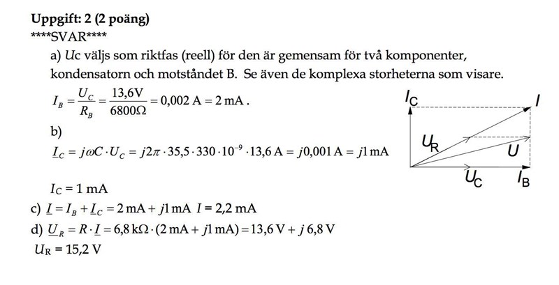 Jag har suttit med denna uppgift ett tag nu. Första uppgifterna är bara att man ska räkna ut Ib, Ic, I och Ur, vilket jag förstått hur man. Jag har dock lite problem med visardiagrammet. Jag förstår att I och Ur går i samma riktning, eftersom det bara finns en ström och en vanlig resistor där. Sedan har jag förstått det som att det bildas en komplex ström över kondensatorn, Ic och denna är 90grader före Ib.