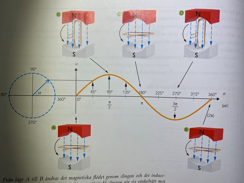 Jag förstår mig inte riktigt på växelström - eller rättare sagt, jag trodde att jag gjorde det innan jag faktiskt började läsa. I situation A i bild ovan menar man att den inducerade spänningen är 0 - varför? Jag tänker själv att arean av slingan som är vinkelrät mot magnetfältet är maximal i detta läge och ger därför maximalt magnetiskt flöde. Tvärtom då i situation B, där magnetfältet är parallellt med arean - här menar alltså jag att spänningen är 0, men egentligen är svaret tvärtom.